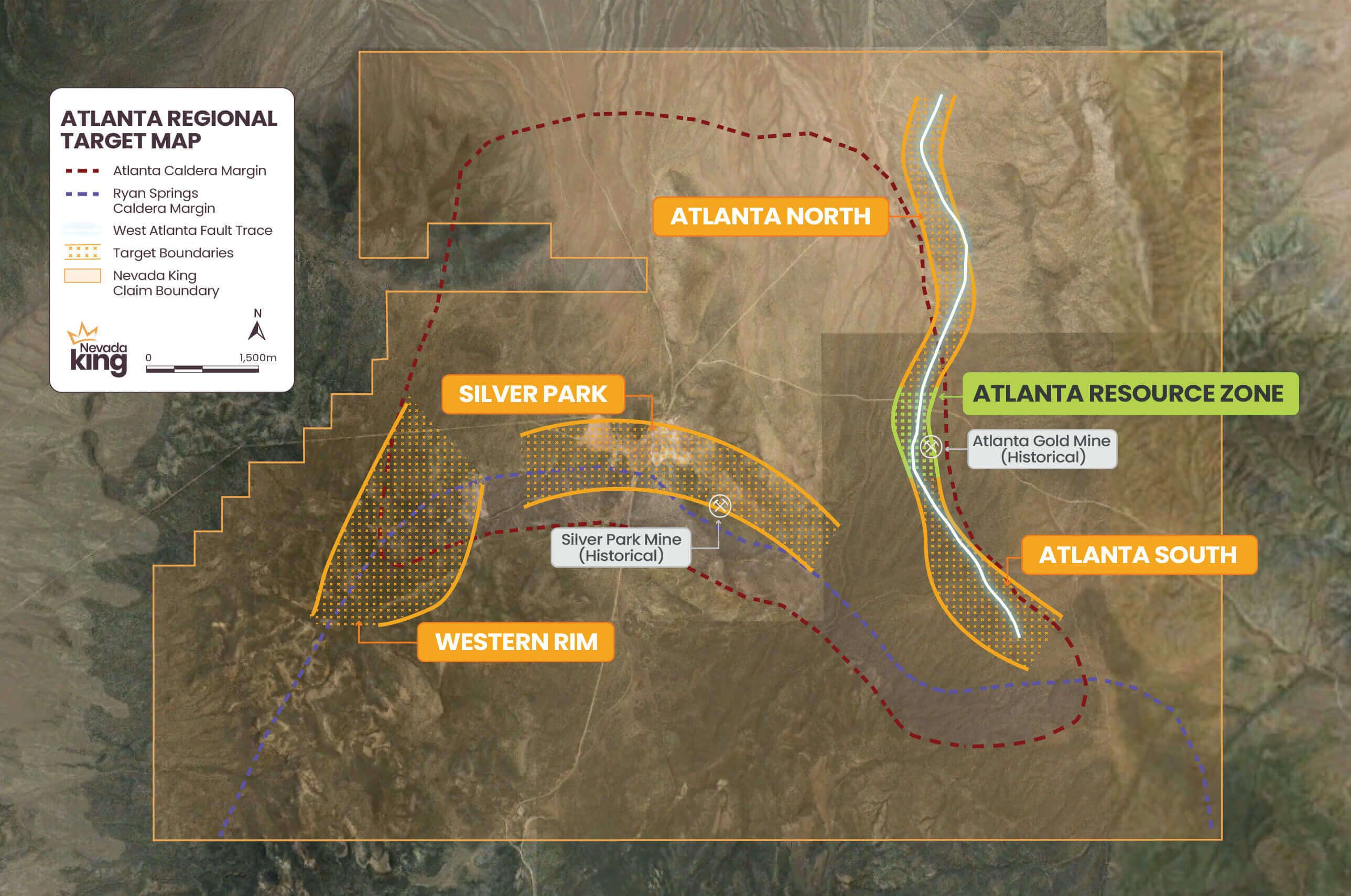 Nevada King is focused on growing its 100% owned, past-producing, 130km2 Atlanta Gold Mine project located in southeast Nevada. The project hosts an NI 43-101 compliant pit-constrained oxide resource of +1moz at +1g/t Au, while the ongoing exploration program looks to expand the resource zone and discover satellite deposits.