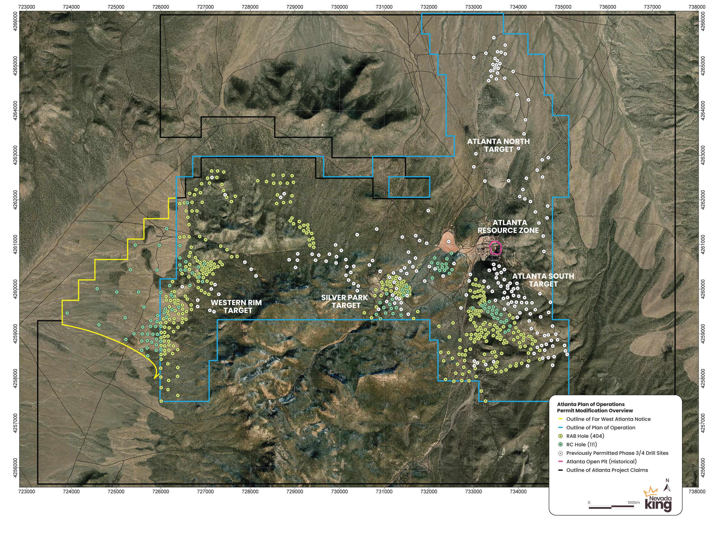 The Company is advancing PoO Mod 5, its most ambitious permitting expansion to date. Upon BLM approval, this will permit an additional 78 RC and 404 RAB drill sites plus associated access routes. Permitted drill areas include Western Rim, Atlanta South, Silver Park, and Atlanta North (see Figure 1 below). This large-scale Plan of Operations covering 45km2, provides a long-term exploration runway and maintains the Company’s ability to remain nimble in follow-up drilling.