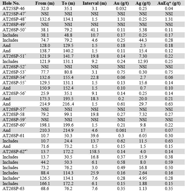 Drill holes AT26SP-58 and AT26SP-63 to the southwest of holes AT26SP-61 and AT26SP-62 both intersected the same oxide mineralization slightly deeper, in both dolomitic basement rock and mineralized intrusives with abundant quartz veining. This suggests strong hydrothermal activity and favourable structure an additional 300 metres southwest, resulting in a largely unexplored footprint 650 metres southwest of the main SPE area, beneath post-mineral cover.